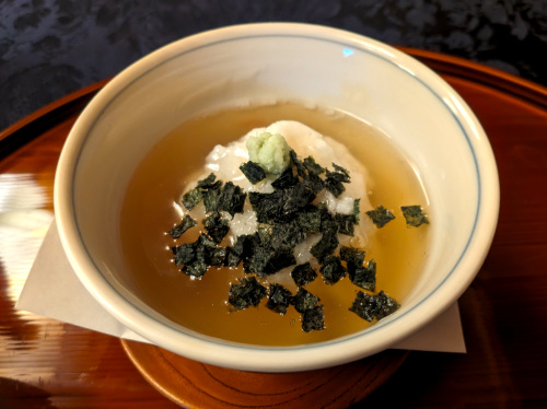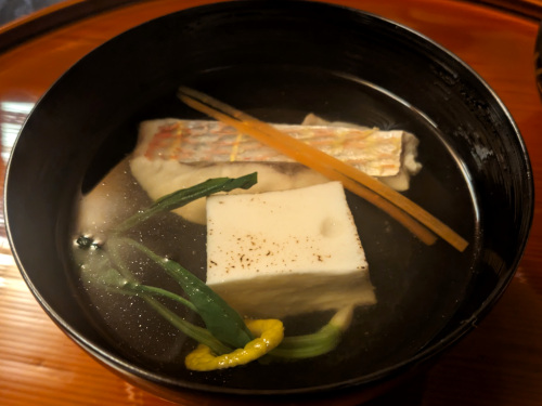 お椀:撚魚葛打き 胡麻豆腐 うぐいす菜 柚子
