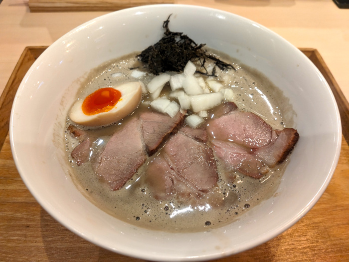 オーダーはもちろん限定の「鬼煮干しそば」(1250円)。セメント色をしたスープに、半熟煮玉子が半分、厚みがあるスモーク肩ロースチャーシューが3枚、生の玉ねぎ、岩海苔と充実した内容。