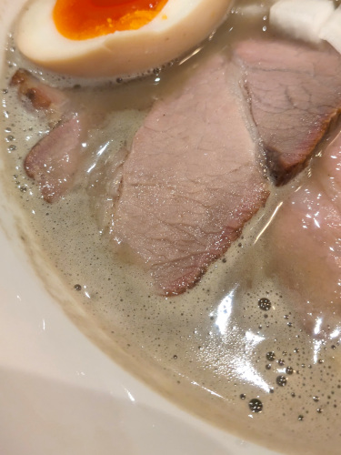 スープは、期待通りに煮干しのビター感と旨味がガツンと効いており、ベースは濃厚な鶏白湯のふくよかな味わいと相まって、スープをすくうレンゲが止まりません。