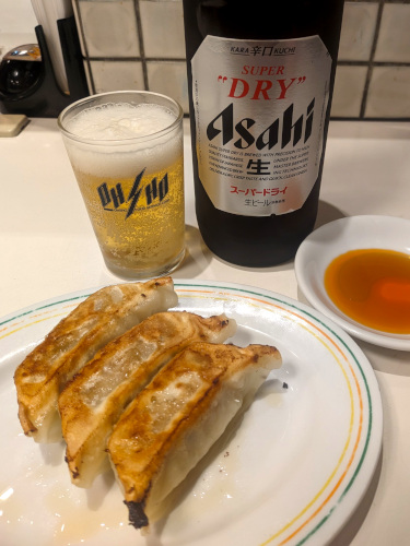 まずは瓶ビールとジャストサイズの餃子でお疲れ様の乾杯。