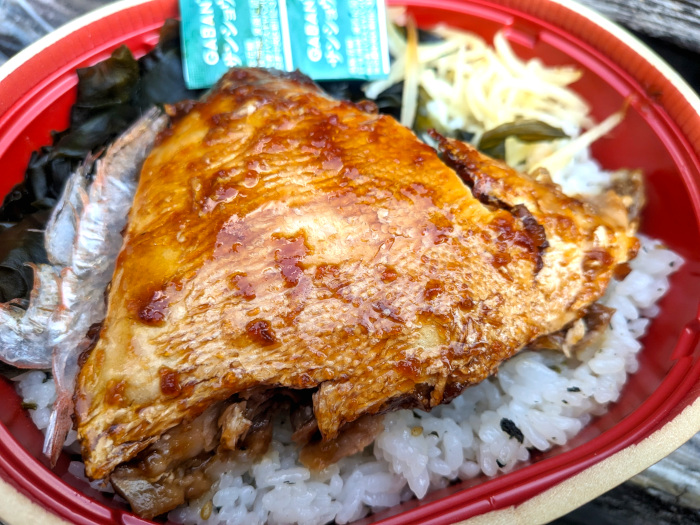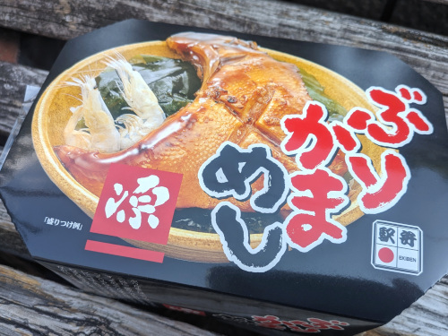 わっぱ状の容器には、大きくて分厚いブリカマがドーンと乗っかっていて迫力がありますな。源にはぶりのすしという氷見産のブリを使った押し寿司も売られており、おそらくそれで余ったブリカマを使っているんでしょうね。