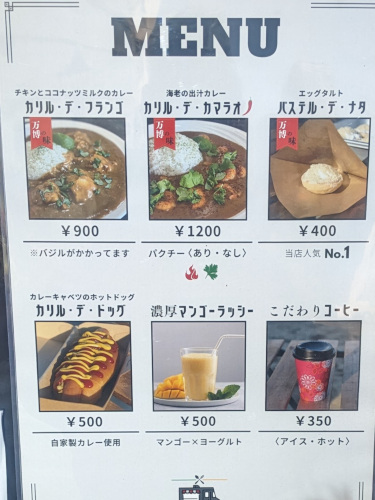 メニューは、海老とチキンの2種類。他にはカレーホットドッグやパステル・デ・ナタというエッグタルト、マンゴーラッシーなんかもありました。