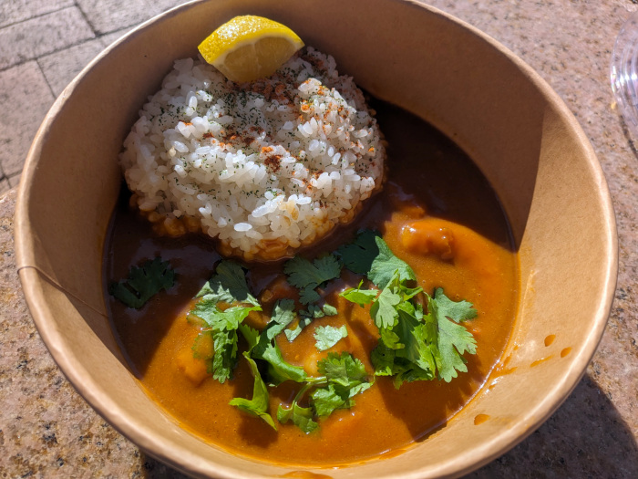 カレーソースは、トマトとココナツミルクがベースで、レモン果汁も入っていて酸味と唐辛子の辛味がビシッと効いて、スパイスとパクチーの香りがエキゾチック。