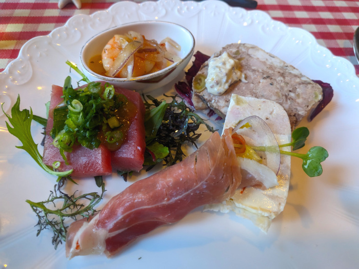 内容はエビのエスカベッシュ、パテ・ド・カンパーニュ、鶏のテリーヌ、生ハム、マグロのカルパッチョと、見た目も味も華やかな一皿。