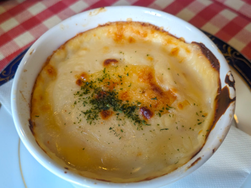 そして冬のトミーにおける影の主役、オニオングラタンスープ。肉と野菜のエキスが詰まったコンソメをたっぷり吸ったフランスパンとチーズの旨味に、じっくり炒めた玉ねぎの甘みが加わってたまりません。寒かったらもっと美味しいんでしょうが、これで十分幸せです。