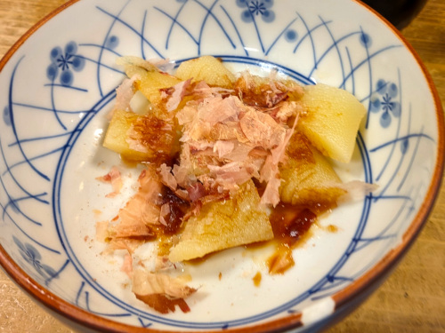 寒い日だったので日本酒の熱燗に切り替え、数の子。市販の味付け品ではなく、ちゃんと塩漬けから戻したボリボリと歯ごたえのある真っ当な品でご機嫌。