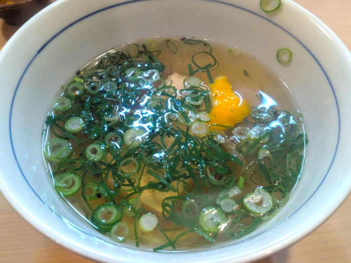 この日は3階で宴会があって料理を出すのに時間がかかるという話だったので、最初から湯豆腐半丁をお願いしました。青ネギとおぼろ昆布が浮かんだ黄金色の出汁はまさに天下一品、これだけで酒が飲める逸品です。