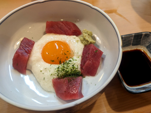 マグロの山かけは、鉄分を感じる本マグロの赤身と粘り強い大和芋のすりおろしで、ありふれた料理なのに一流の味わい。