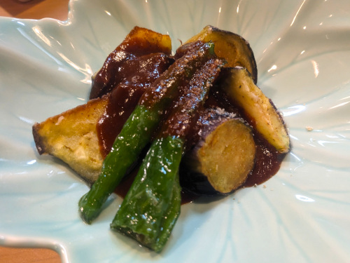 素揚げしたナスとししとうに、甘めの味噌をかけた田楽。揚げたてのホクホクで体が温まります。