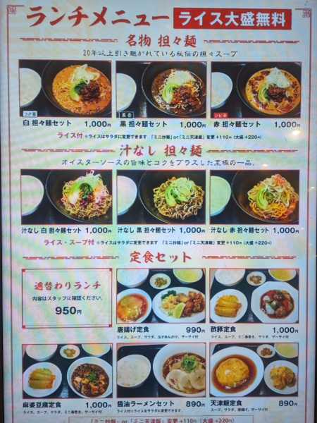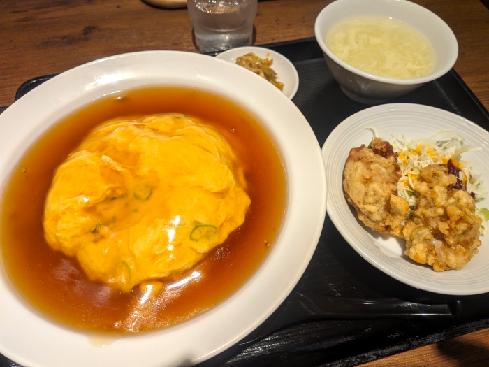 店の売りは担々麺みたいですが、こないだ王将で食べたばかりだったのでパス、890円の天津飯定食をオーダーしました。