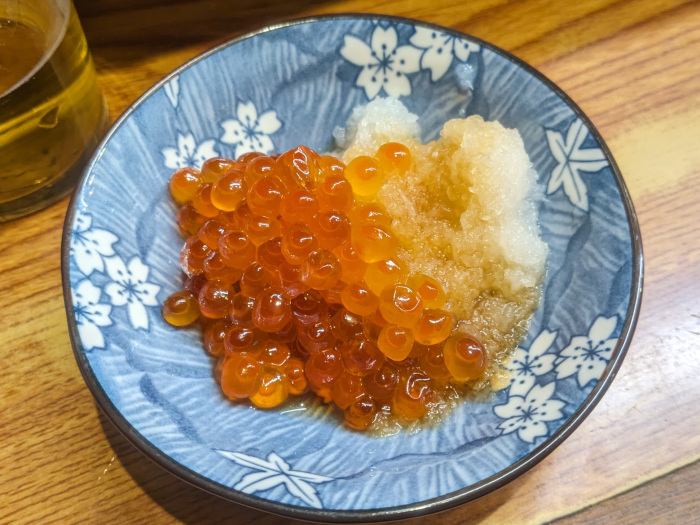 もちろん熱燗を追加、ピカピカのイクラおろしもいただきます。