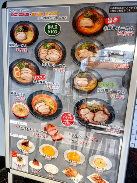 メニューは大きく分けてラーメンとつけ麺、まぜそばの3種類で、スープは全て豚骨ベースで”らいと”、”へびー”、”すーぱーへびー”の3種類から選ぶことが出来ます。今回はデフォルトの「豚豚らーめん」(1000円)をすーぱーへびーでお願いしました。