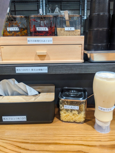 卓上には、刻みニンニク、ピリ辛高菜、黒紅生姜、ゴマ、白醤油マヨネーズと種類は豊富。特に、ニンニクがおろしじゃなくて刻みなのは嬉しいですな。どうもご馳走様!
