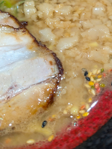 麺は中太のストレートで、もちもちの食感と強いコシがあって濃厚スープをしっかり受け止めています。チャーシューは3mm厚ぐらいのバラ肉が2枚、肉質はそこそこで味付けは薄め、ちょっとスープに負けている印象。あとは千切りのきくらげと青ネギ、ぱらりとゴマが振られています。