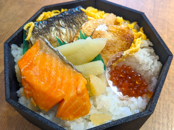 蓋を開けてみると、名前通りにノドグロの塩焼き、ニシンの甘露煮、焼き塩鮭、数の子、イクラといった日本海の海の幸が、錦糸卵が載った酢飯の上にビッシリ敷き詰められていて迫力満点です!