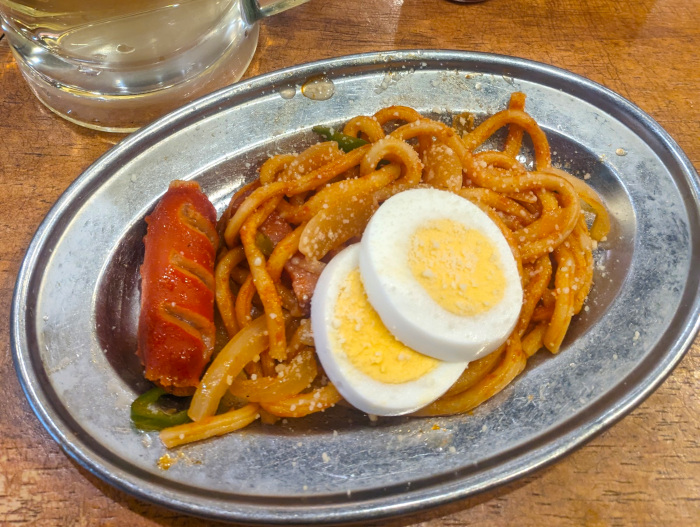 あらかじめ調理されたものがレンチンされて出てくるナポリタン。小さめサイズで食べやすく、タバスコをぶっかけるとハイボールに合いますな。チープな赤ウインナーとゆで卵もアテになります。