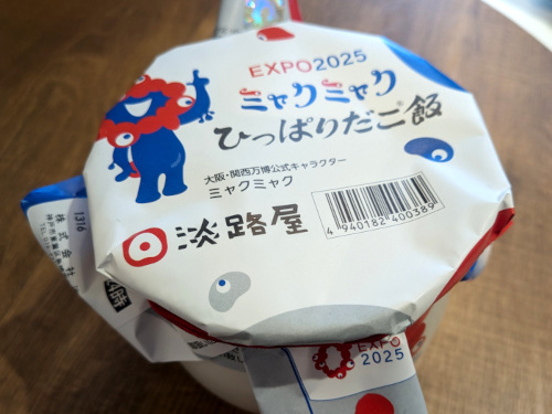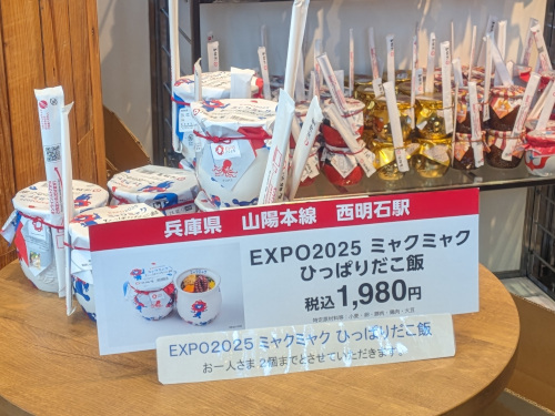既に輸送駅弁のコーナーには大行列が出来ていましたが、15分ほど並んで売り場に入場。その入口で、あの「EXPO2025 ミャクミャク ひっぱりだこ飯」を希望者に最大2個までの配布が行われていました。
