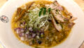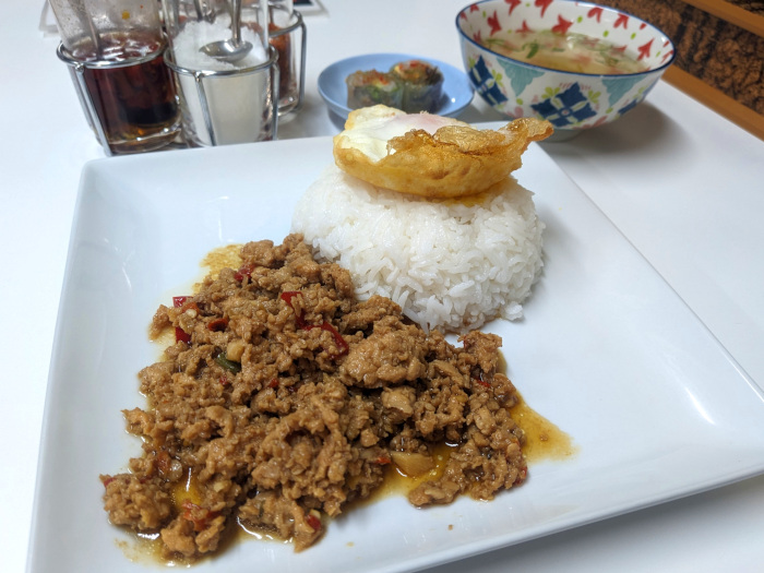 ガパオは鶏ひき肉を炒めたもので、残念ながらホーリーバジルは使われていません。ライスもタイ米ではなく日本米でした。そして揚げ焼きにした半熟目玉焼き。味は少し甘めで辛さもほとんど無かったので、卓上にあるナム・プリックを適宜かけながらいただきましたよ。