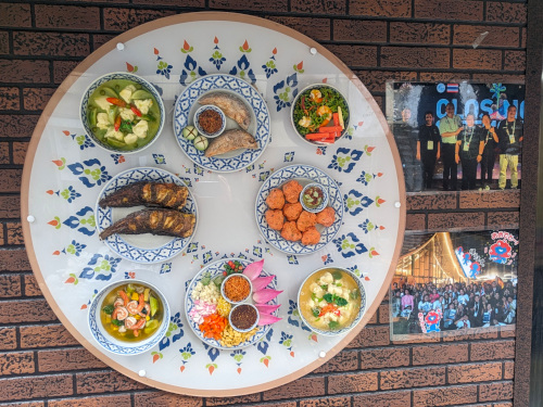店外と店内にはタイパビリオンで展示されていたタイ料理の模型が飾られています。横には最終日に撮影したんでしょうか、パビリオン前でスタッフの集合写真が飾られています。