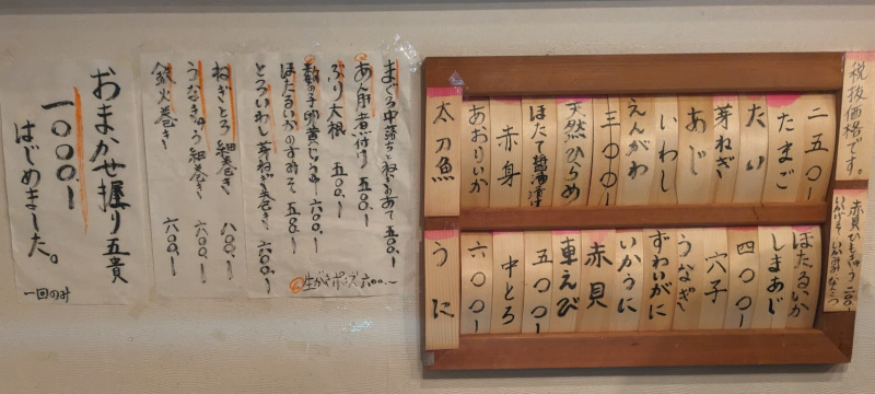寿司は1貫250円から600円まで、あとは1000円以下のアテが数種類あり、ドリンクは500円均一、5貫で1000円のおまかせ握りが用意されているなど、メニューの構成と値段は越中屋と全く同じです。