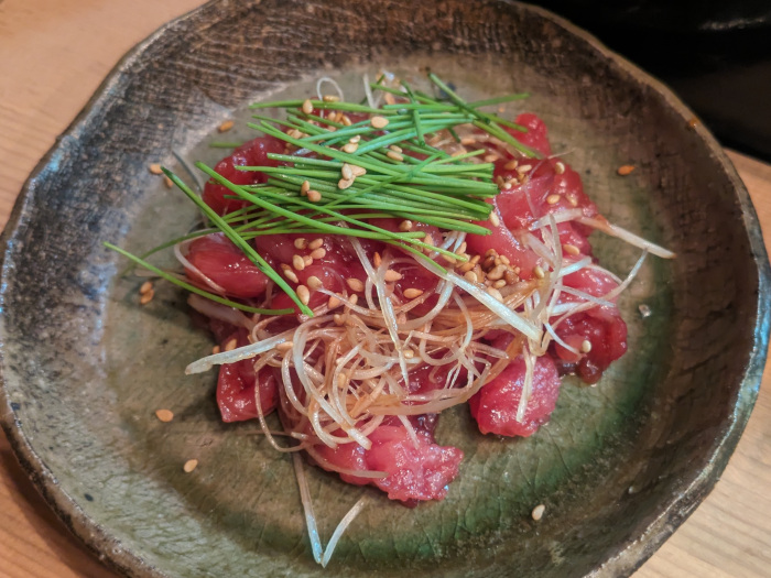 アテのまぐろ中落ちは、血の味が濃いまぐろに優しい醤油味が忍ばせてあってしみじみ旨し。