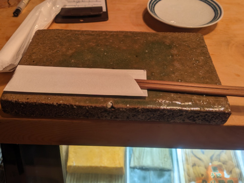 この態勢でカウンターから寿司を口へ運ぶのは難儀なためか、寿司の付け皿は冷蔵ネタケースの上に置かれてあります。