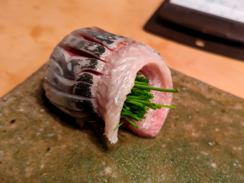 とろイワシの芽ねぎ巻きは、脂が乗って肉厚のイワシとさっぱりした芽ネギのコントラストが楽しい。