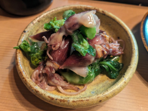 旬のホタルイカ。さっぱりと酸味が効いた酢味噌と、菜の花のほろ苦さで酒が進みます。