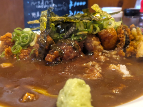 ねぎカツライスとは、エビフライとヘレカツ、ナスのフライ、ハッシュポテトがご飯の上に載せられ、海苔と青ネギ、甘辛ダレ、練りワサビがかかっている品で、あいがけでそこにどっさりとビーフカレーがかけられるという極めて情報過多な内容。