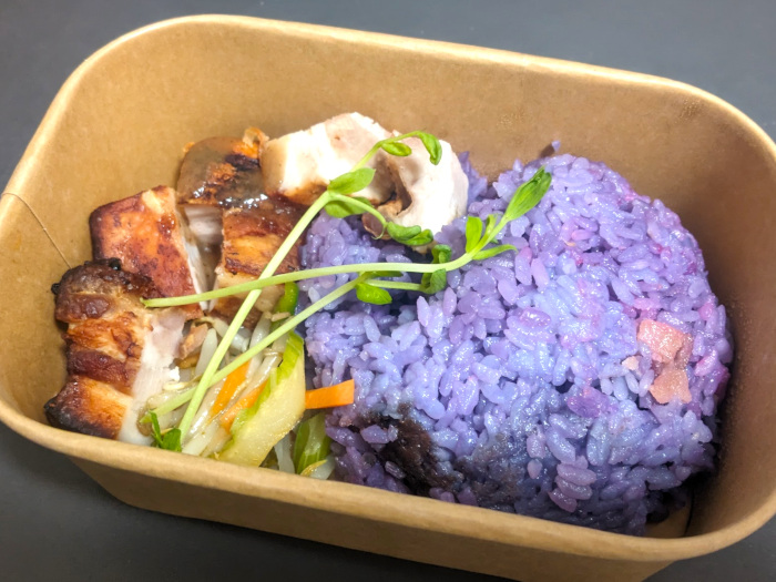 肝心の中身は、皮がカリカリに揚がった豚バラ肉とウベという紫芋の粉で炊いた紫色のご飯は一緒ですが、付け合せがもやし主体の和え物と豆苗に変わっていました。そして何より、甘酸っぱいピーナツソースがほんのちょっぴりしか入ってなかったのはガッカリ。