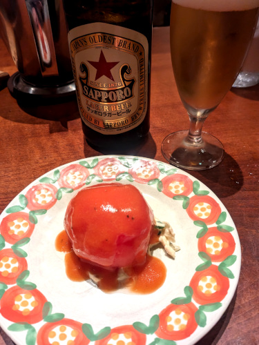 まずは名物のトマトサラダが登場。コールスロー風のツナとキャベツのサラダの上に、湯剥きして冷やしたトマトが乗っかり、トマト味のドレッシング。口の中が濃厚トマト一色になります。
