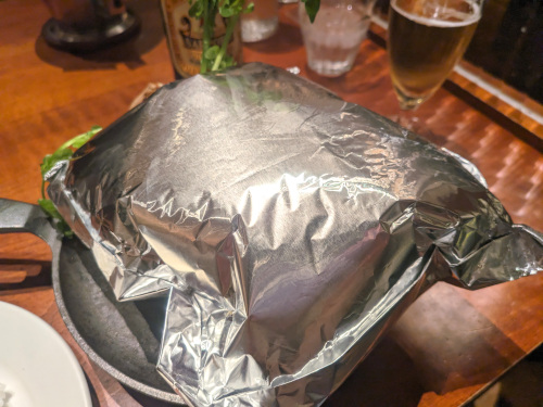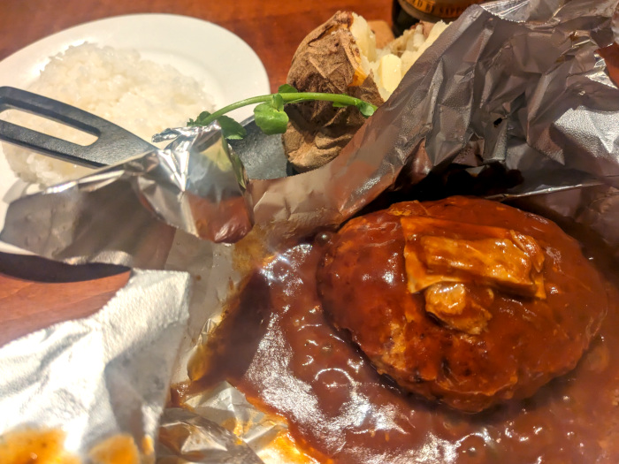 ハンバーグは熱々の鉄板に乗せられ、アルミホイルに包まれて登場!
