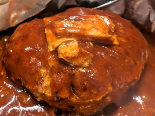ハンバーグは粗挽きの肉が使われ、非常に肉肉しくて美味しいです。肉汁ブシャーの仕込みも少し感じられるけど、鉄板でソースが煮詰まるのでちょうど良い感じ。