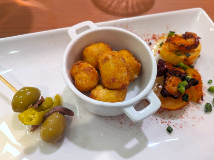 右はガリエガ風タコのフリットで、オリーブオイルの風味とパプリカの香りがワインに良く合います。