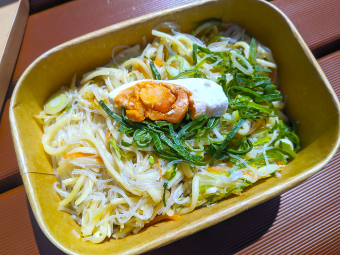 食べてみたら、玉子麺と緑豆春雨、もやし、ニンジン、セロリ、鶏肉、ゆで卵が入った塩味の焼きそばで、万博には入っていたらしい海老も見当たらず、これで1500円はちょっと高い買い物でしたね・・・(^_^;)
