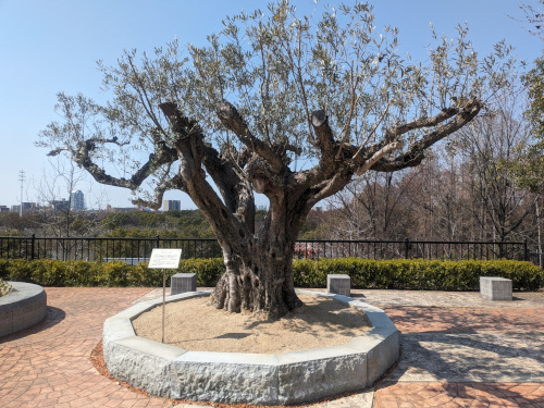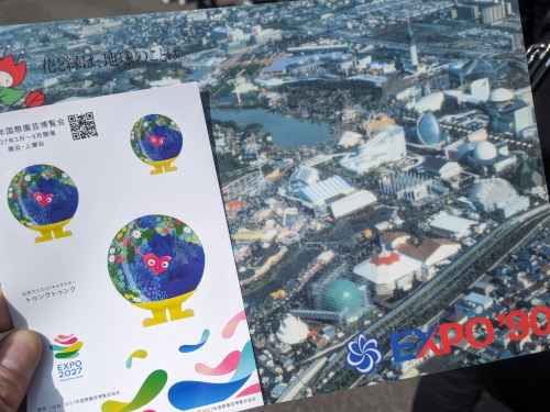 万博のモナコパビリオンからオリーブの木が移設された国際庭園ではスタンプラリーが行われ、先着250人には90年花博の下敷きとトゥンクトゥンクのステッカーがもらえました。