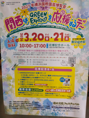 鶴見緑地では「関西はGREEN×EXPO2027を応援するデー」と称して、花博記念ホールでは講演や演奏、パフォーマンスが行われ、ピンバッヂの販売に長蛇の列が出来ておりました。