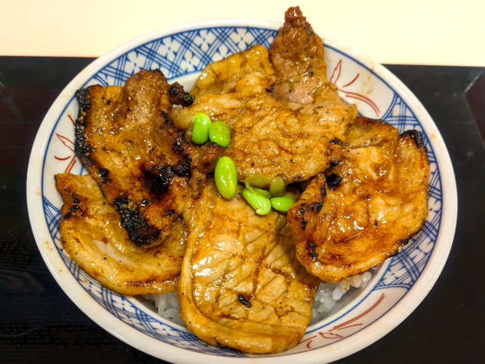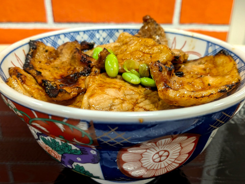 ご飯の上には、炭火で焼いてタレをかけた豚肉がビッシリ敷き詰められていて壮観ですな!