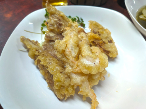 卓上に天ぷらがあったので頼んでみたら、1個だけが富山の白エビで、他は甘辛く煮込んだタケノコ田舎煮を天ぷらにしたもので、図らずもタケノコ三昧となりました。
