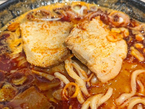 5辛程度だったらそんなに大したことはないだろうと高をくくっていたら、魚介味噌味のスープの上には唐辛子とラー油がビッシリ、これはかなり凶悪なビジュアルですな・・・(^_^;)。