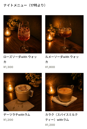 さらに、25日からはカクテルなどアルコールを含むナイトメニュー(17時以降)が提供されると聞いて、ちょうどスタートの時間に訪問してきました。